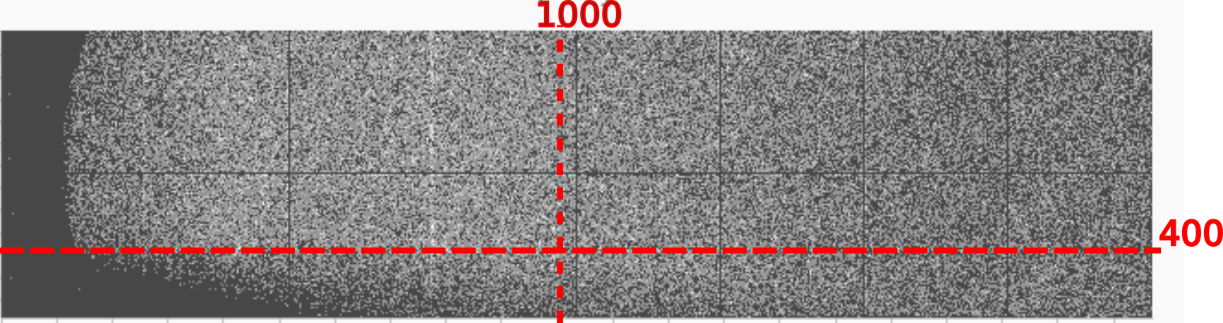 The experiment was conducted in experimental hutch 2, with data saved to the following path '/dls/science/groups/das/ExampleData/i07/fast_rsm_example_data/si41357-1' within the subfolder 'sample_A'. The beam centre is show in the image below with the two red lines, and the detector distance was 89 cm. You would like for all images to be combined into one map of the horizontal vs vertical exit angle, with a size of 800x800 pixels saved into a 'sample_A' subfolder in '/home/myoutputs/'. The detector positioning system was not used.